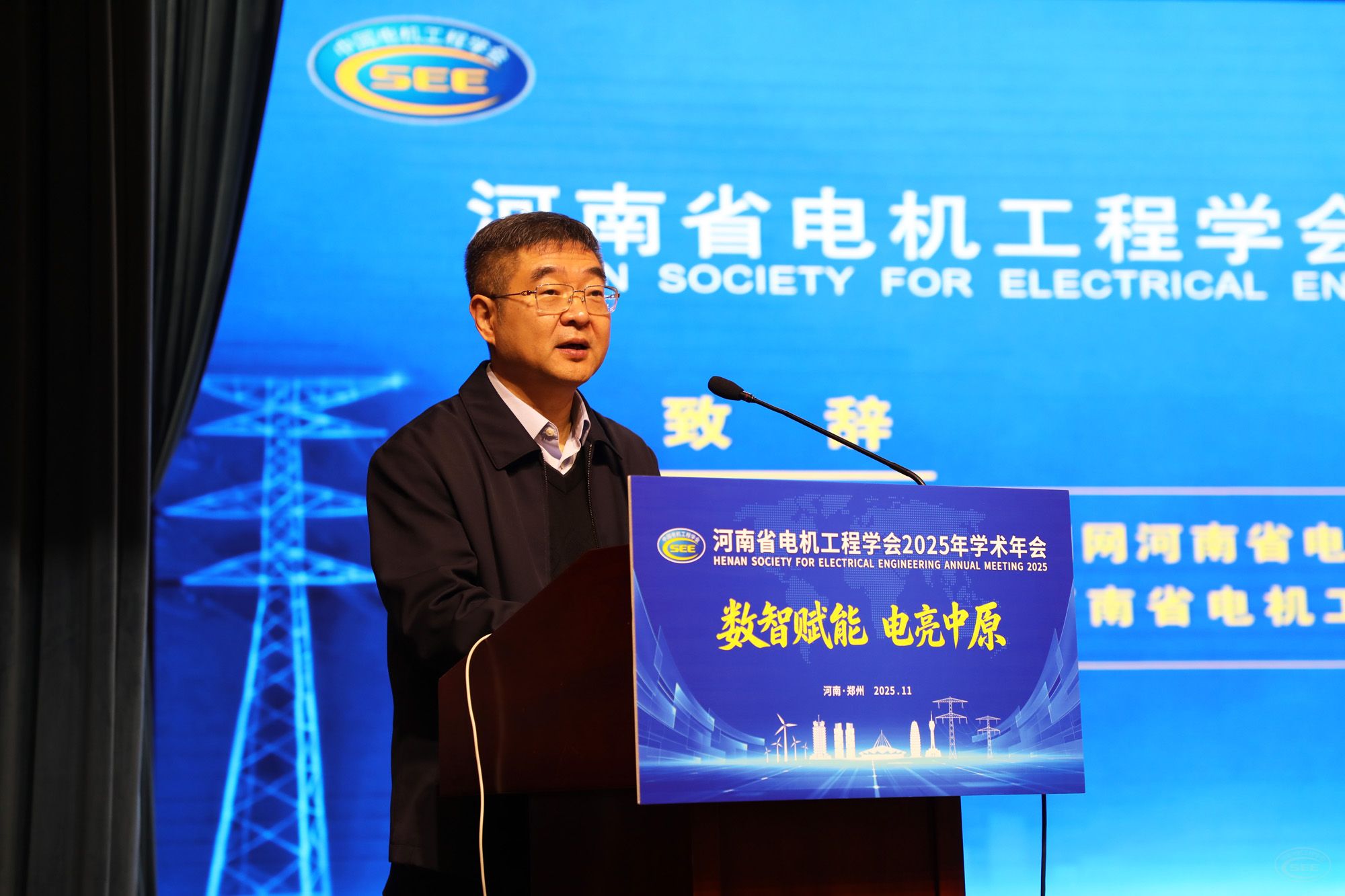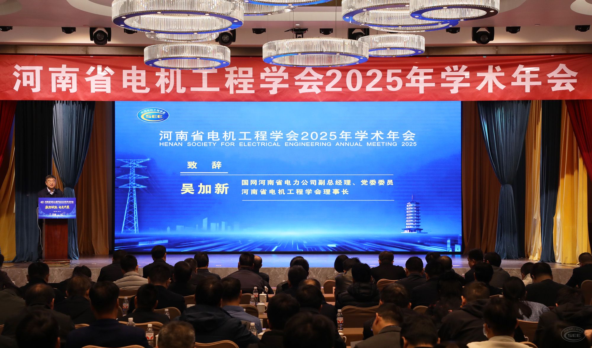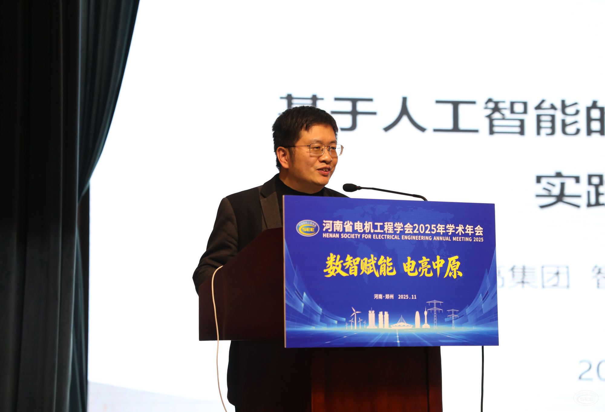 11月11日,河南省电机工程学会2025年学术年会在郑州召开。会议以“数智赋能 电亮中原”为主题,聚焦安全绿色智能、服务双碳目标,深入探讨构建新型电力系统、促进能源转型发展的关键技术和重大课题,邀请5名行业专家学者作主旨报告,举办2025年河南电力青年科技沙龙等8场专题学术交流活动。学会理事长吴加新出席会议并致辞。学会副理事长翟焱,监事长盛卫平出席会议。学会秘书长孙启伟主持大会开幕式,副秘书长和萍主持大会主旨报告。